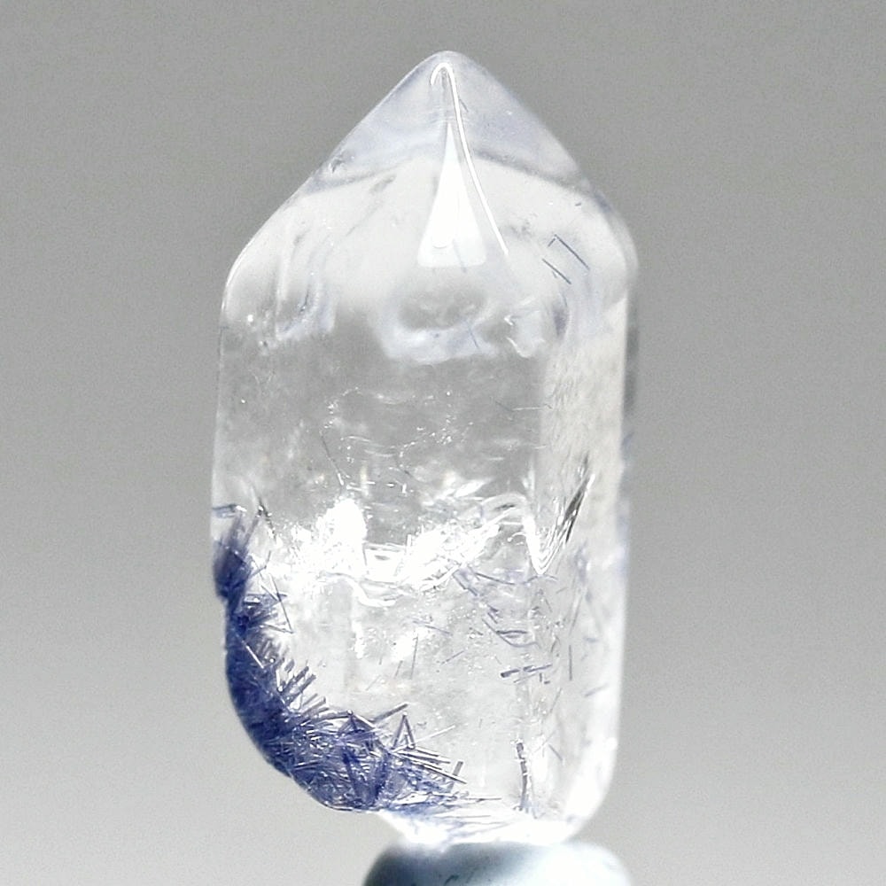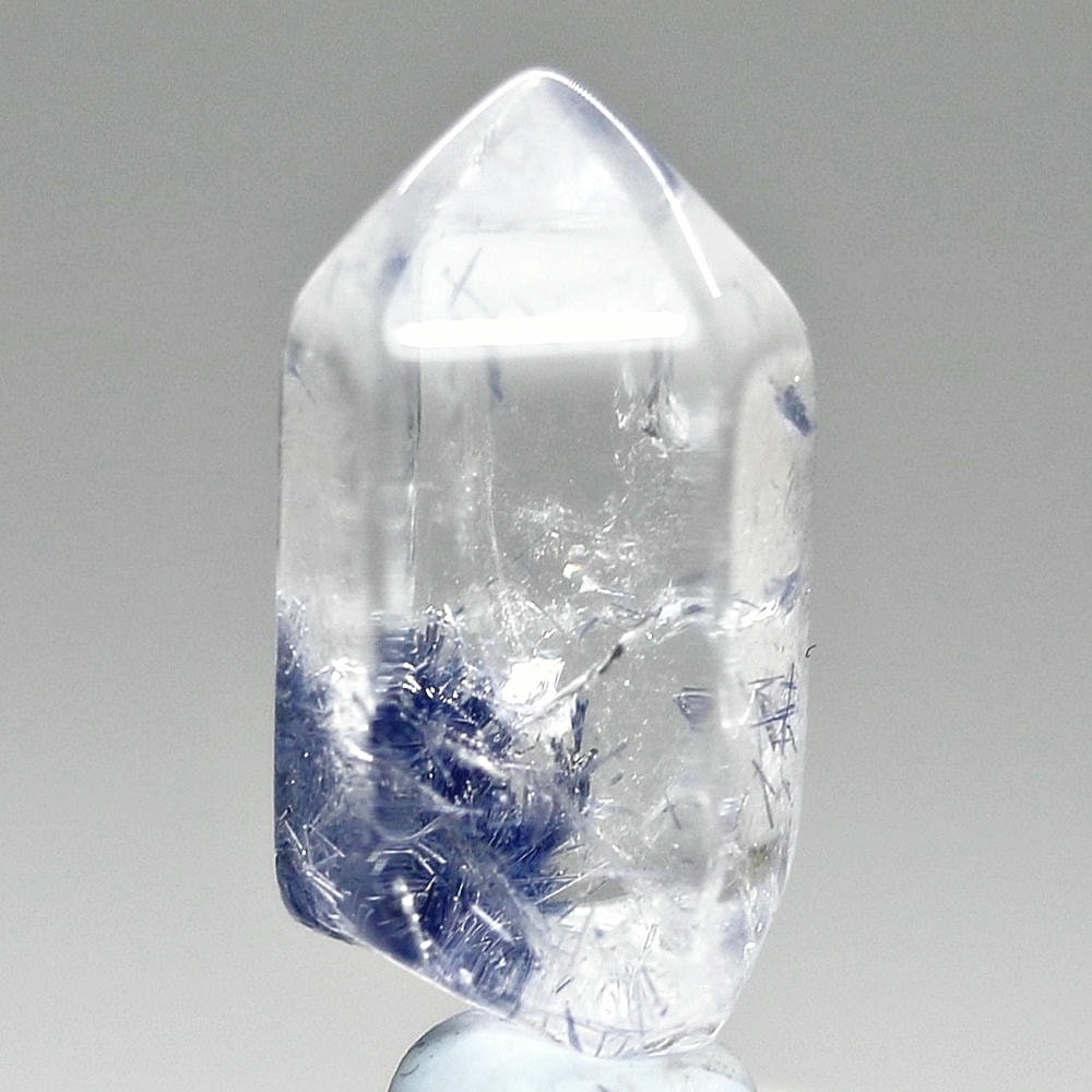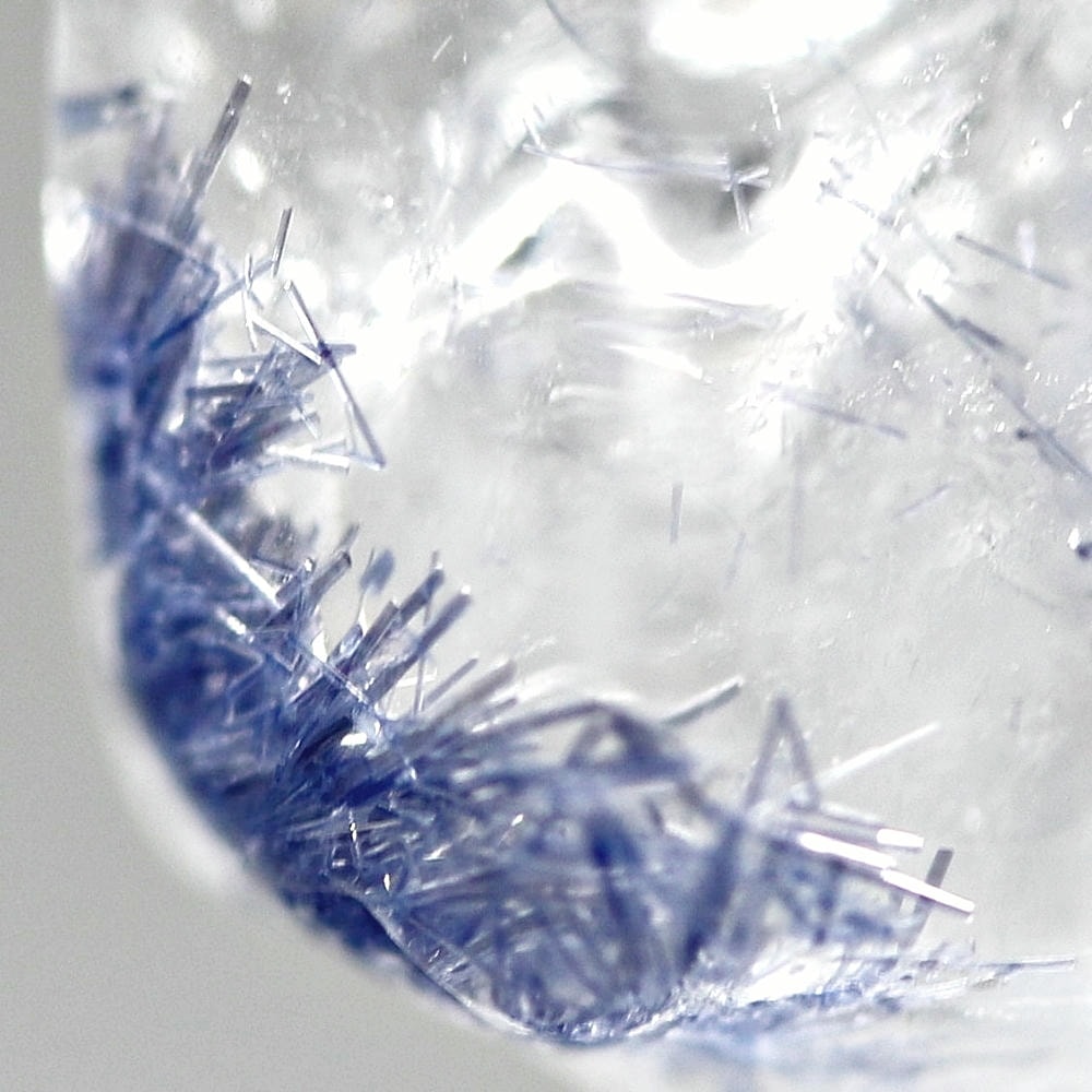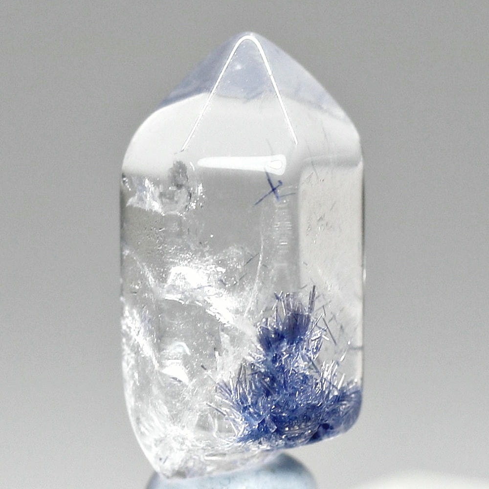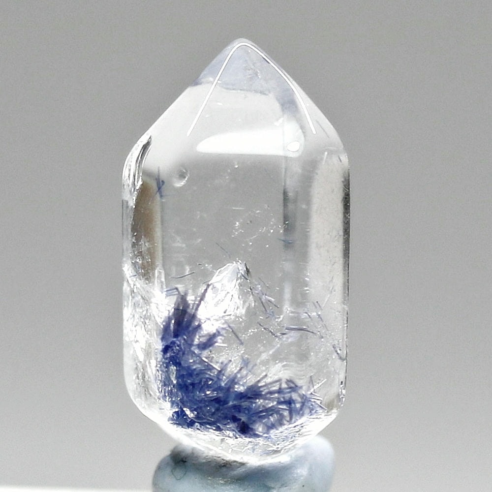 ご覧のお品は、クリアな水晶に鮮やかな青色の結晶が底部から内部へと見られ、特有の細やかな針状結晶の表情までも確認できる、見応えのある逸品です。