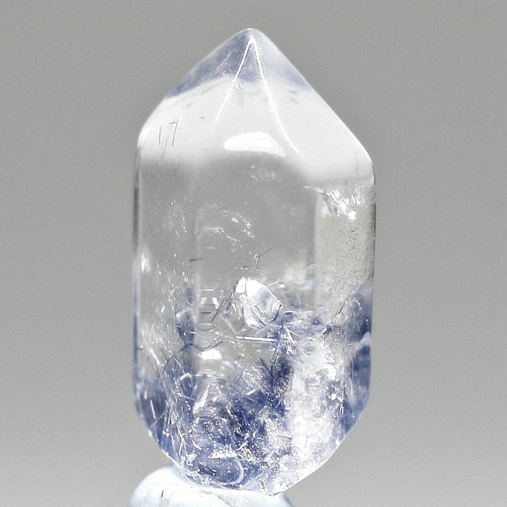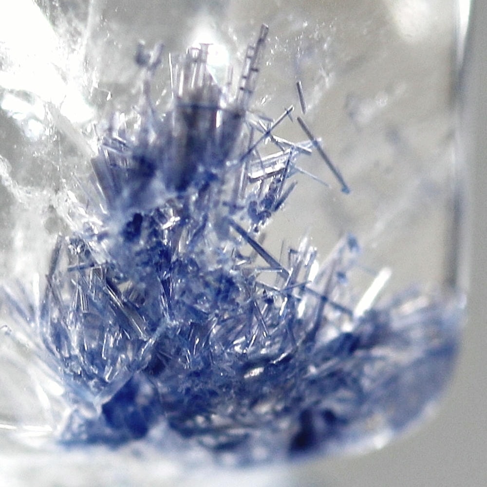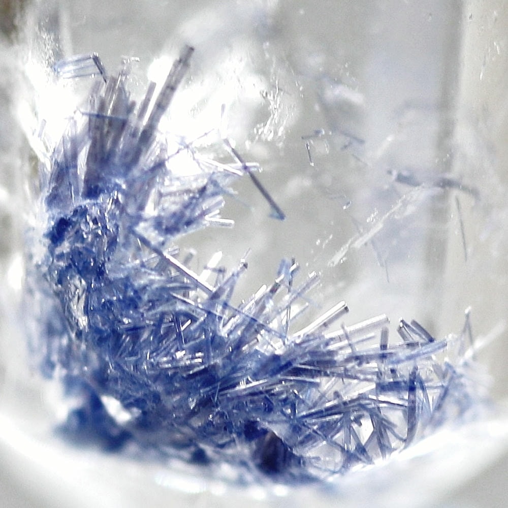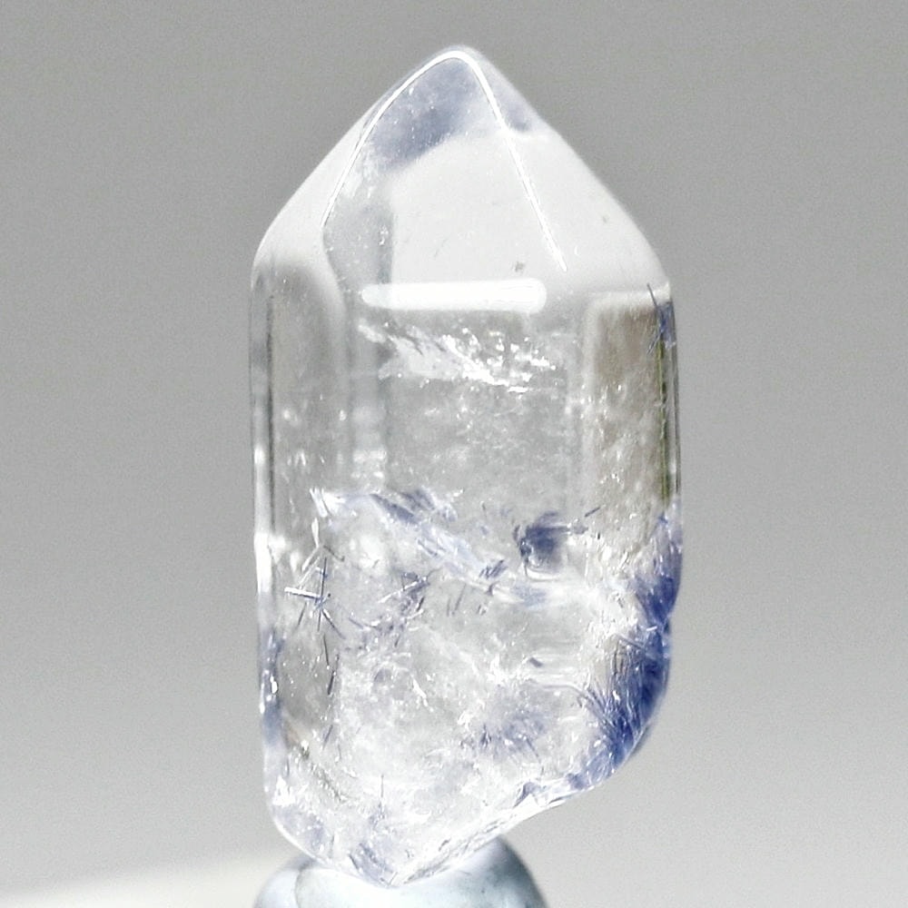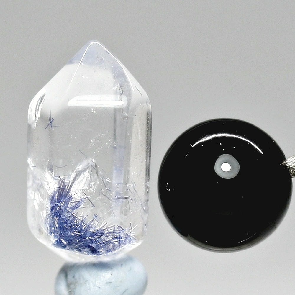 ご覧のお品は、クリアな水晶に鮮やかな青色の結晶が底部から内部へと見られ、特有の細やかな針状結晶の表情までも確認できる、見応えのある逸品です。