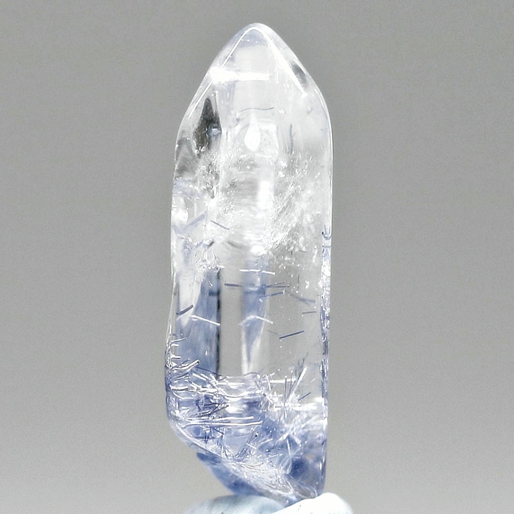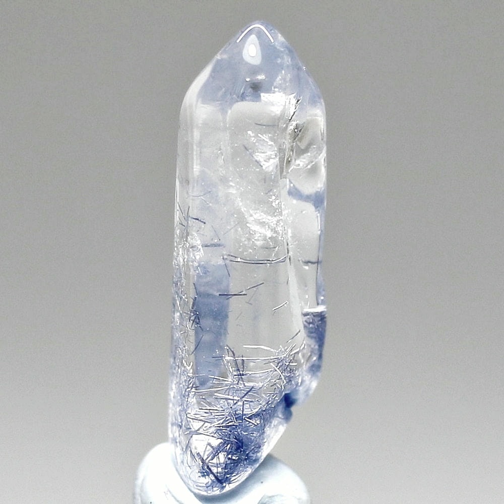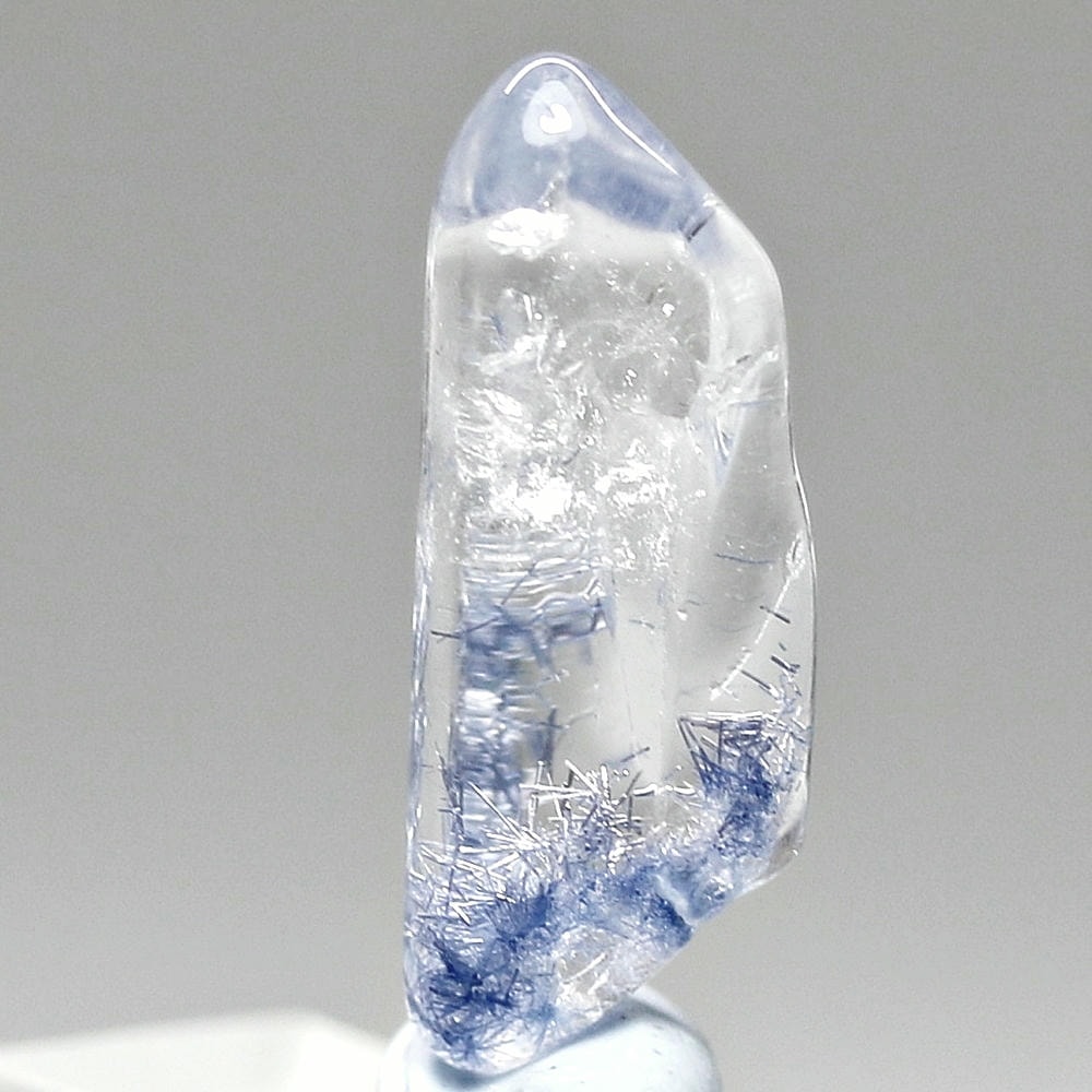 ご覧のお品は、クリアな水晶に鮮やかな青色の結晶が底部から内部へと見られ、特有の細やかな針状結晶の表情までも確認できる、見応えのある逸品です。