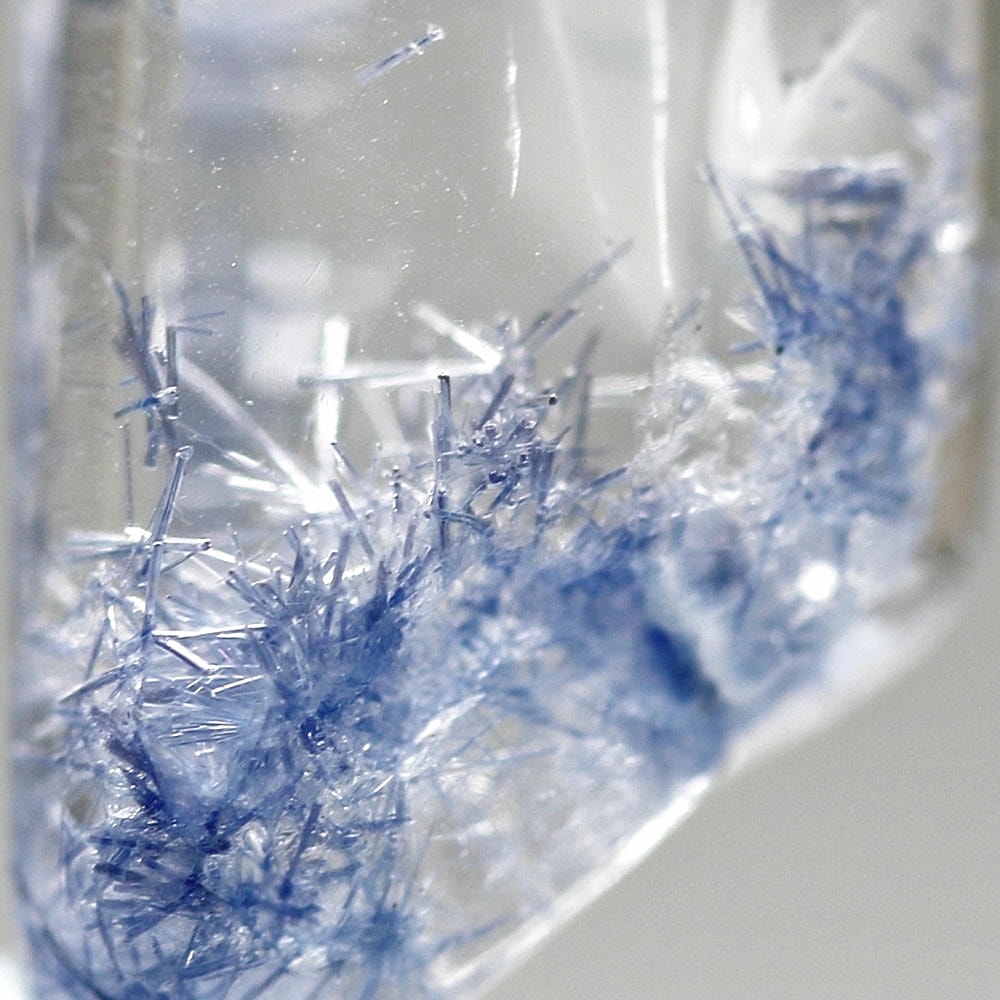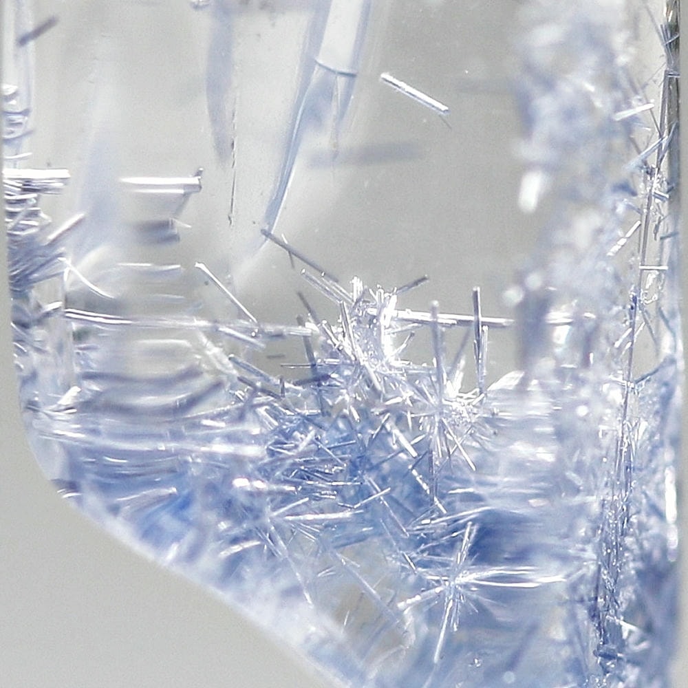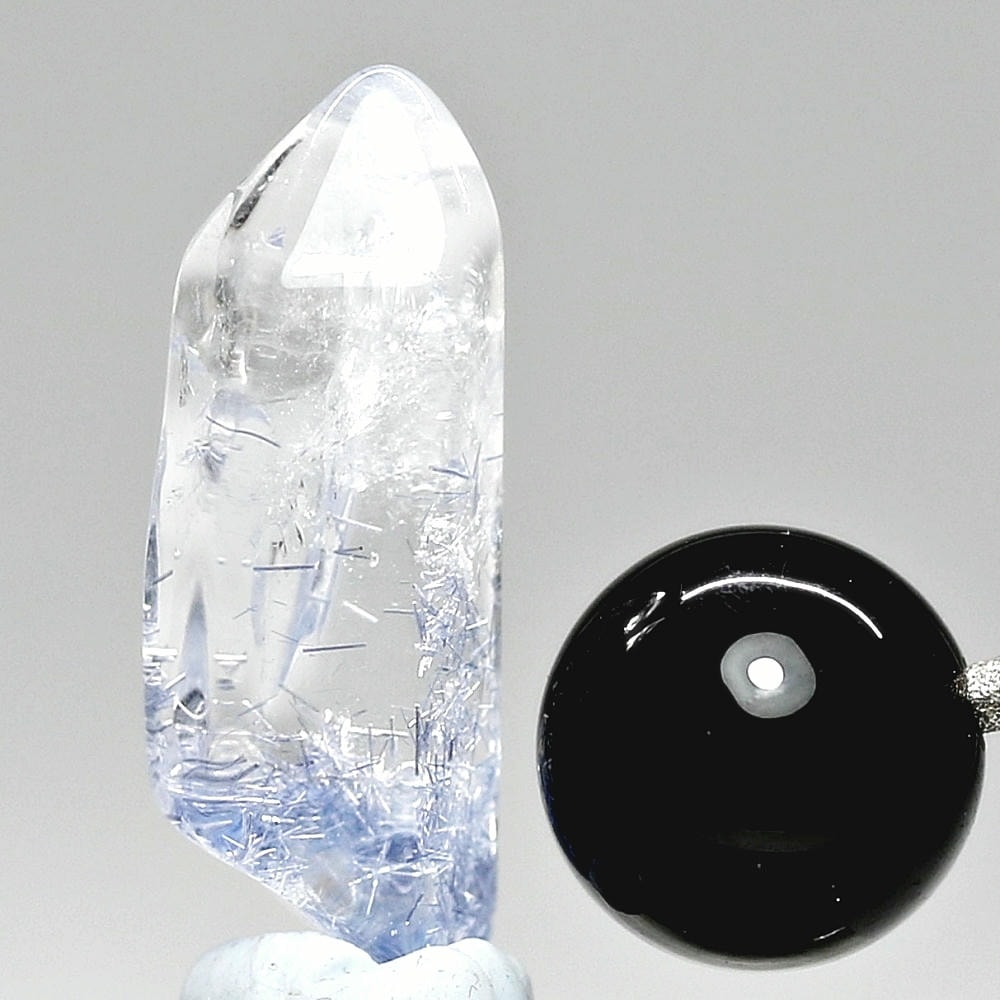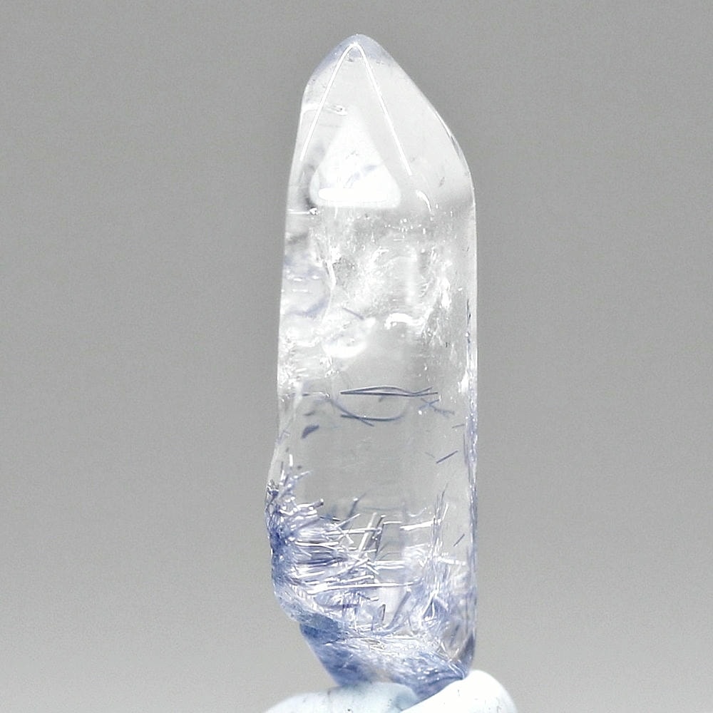 ご覧のお品は、クリアな水晶に鮮やかな青色の結晶が底部から内部へと見られ、特有の細やかな針状結晶の表情までも確認できる、見応えのある逸品です。