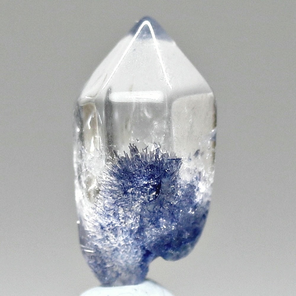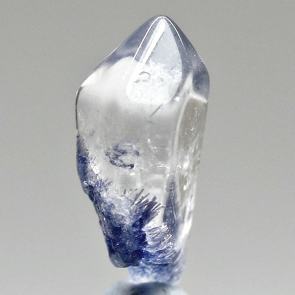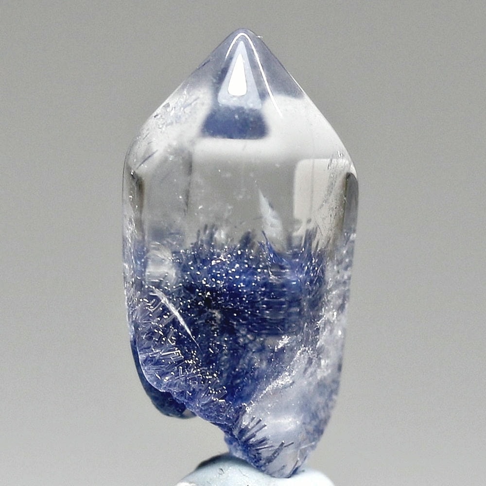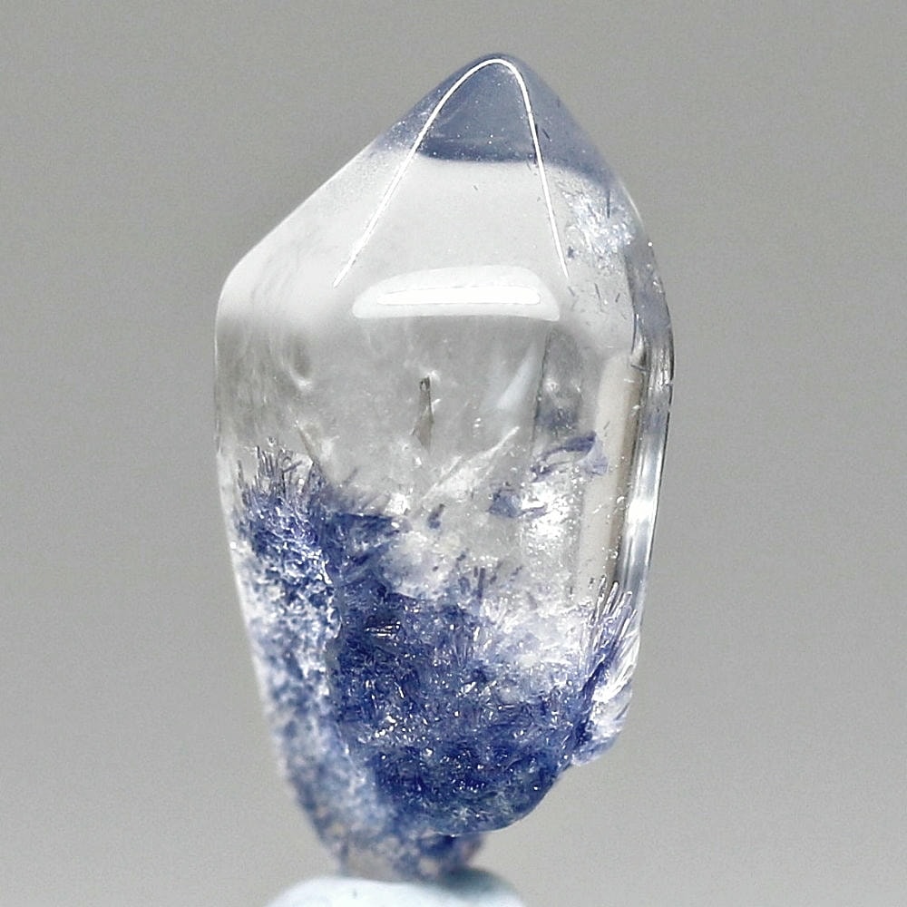 ご覧のお品は、クリアな水晶に鮮やかな青色の結晶が底部から内部へと見られ、特有の細やかな針状結晶の表情までも確認できる、見応えのある逸品です。