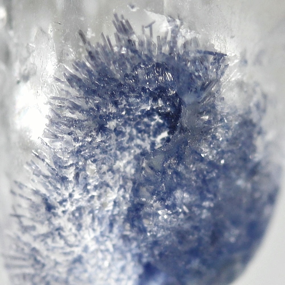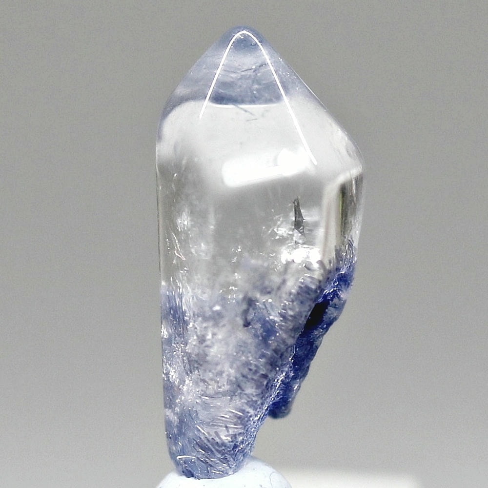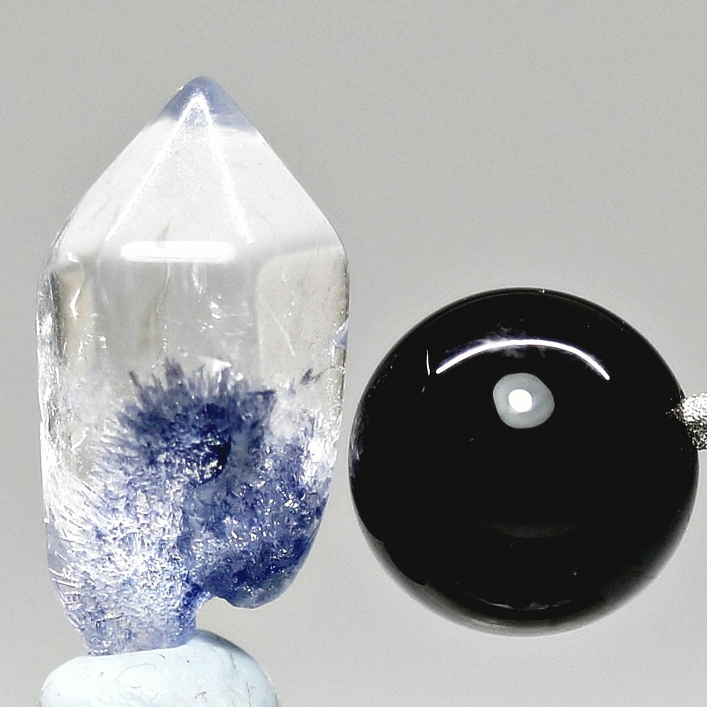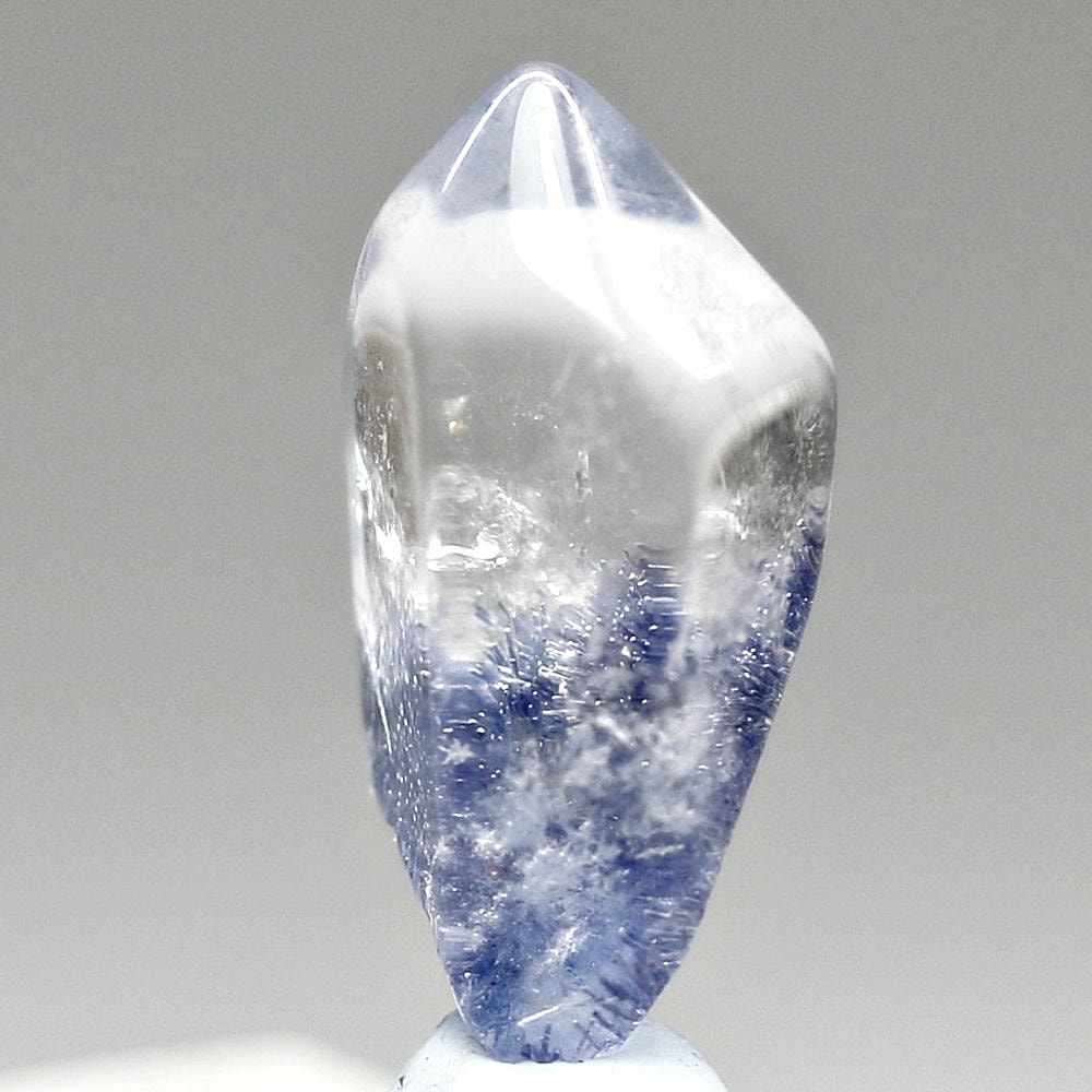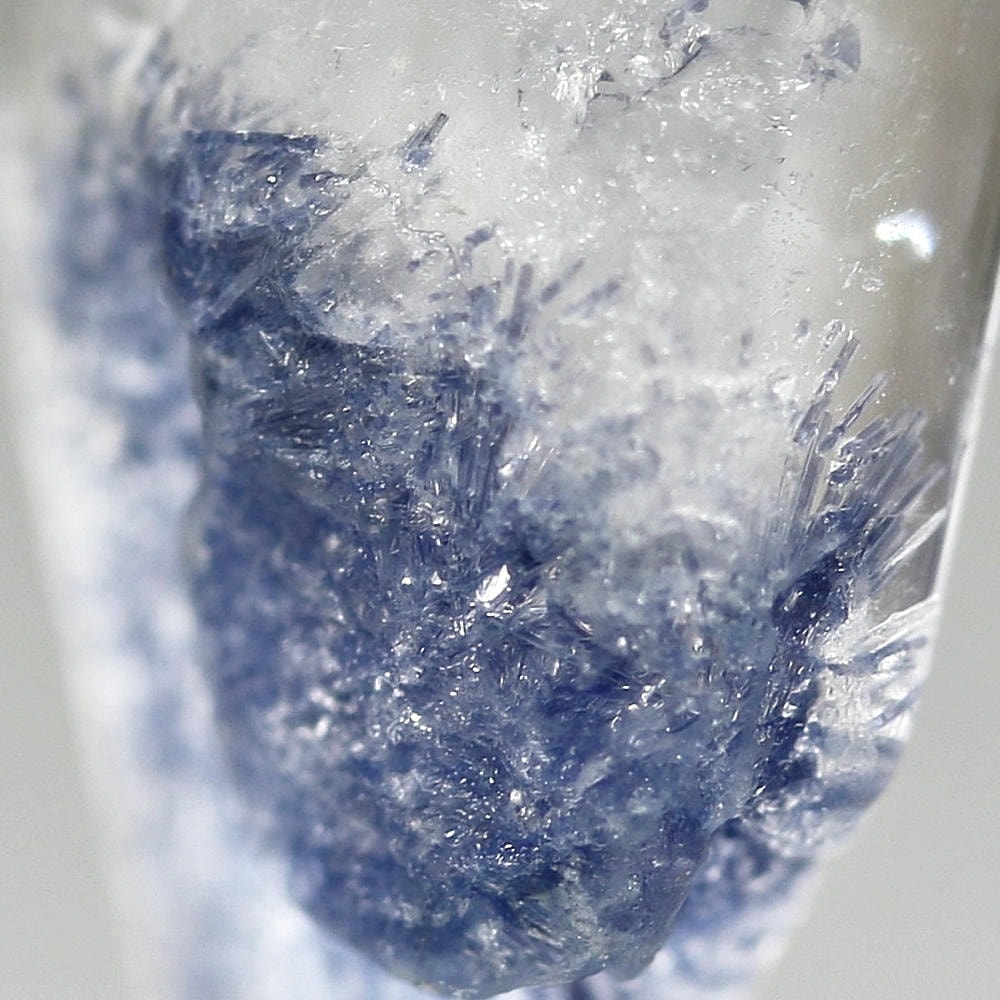 ご覧のお品は、クリアな水晶に鮮やかな青色の結晶が底部から内部へと見られ、特有の細やかな針状結晶の表情までも確認できる、見応えのある逸品です。