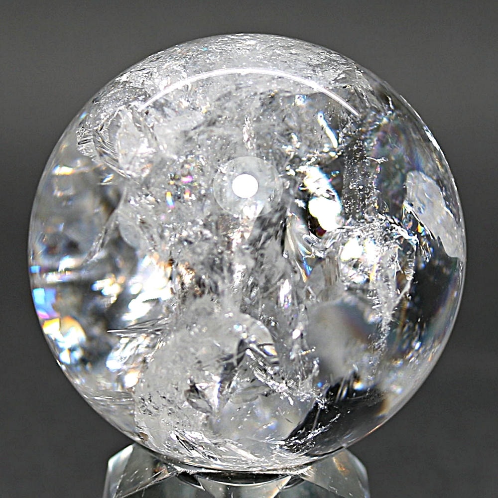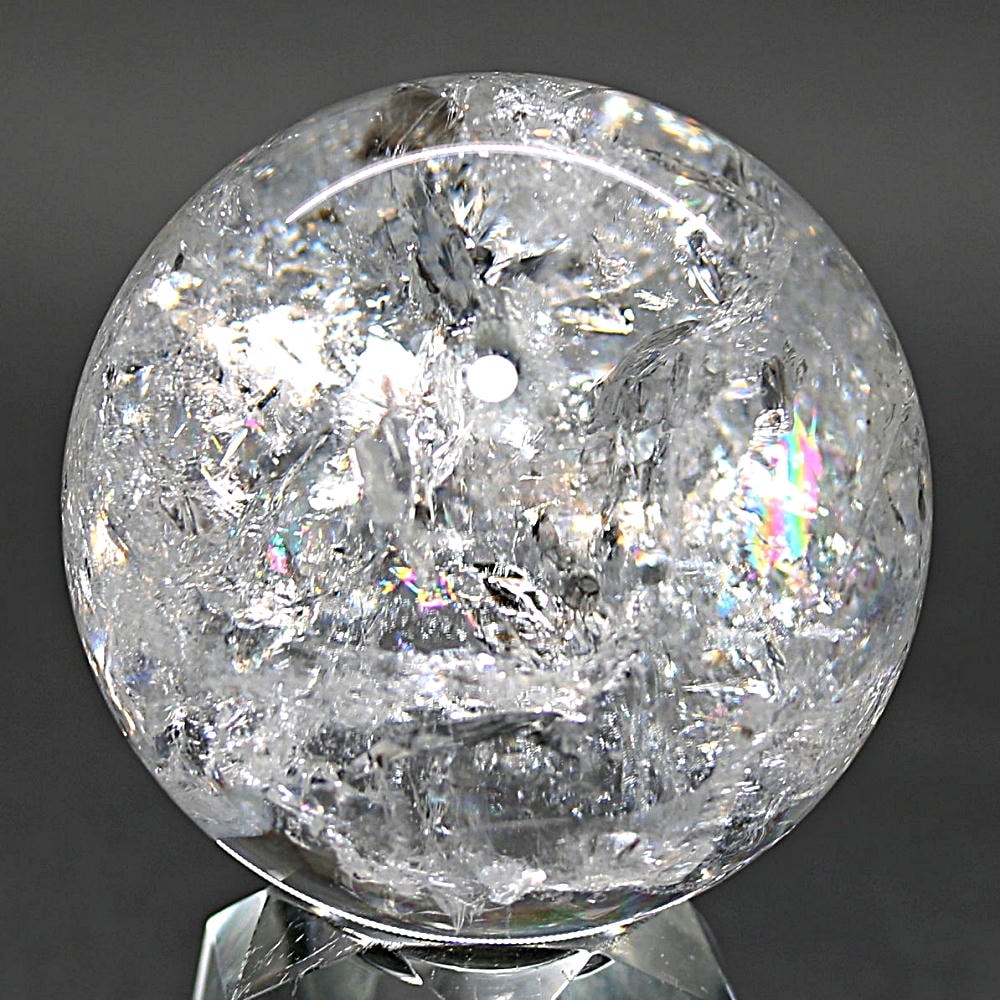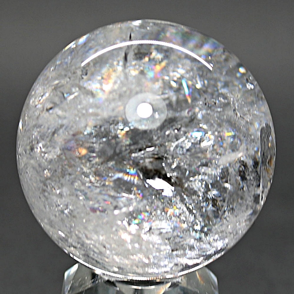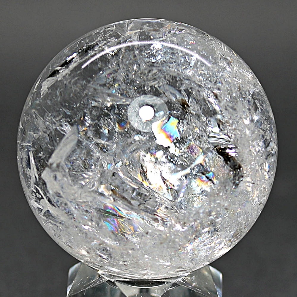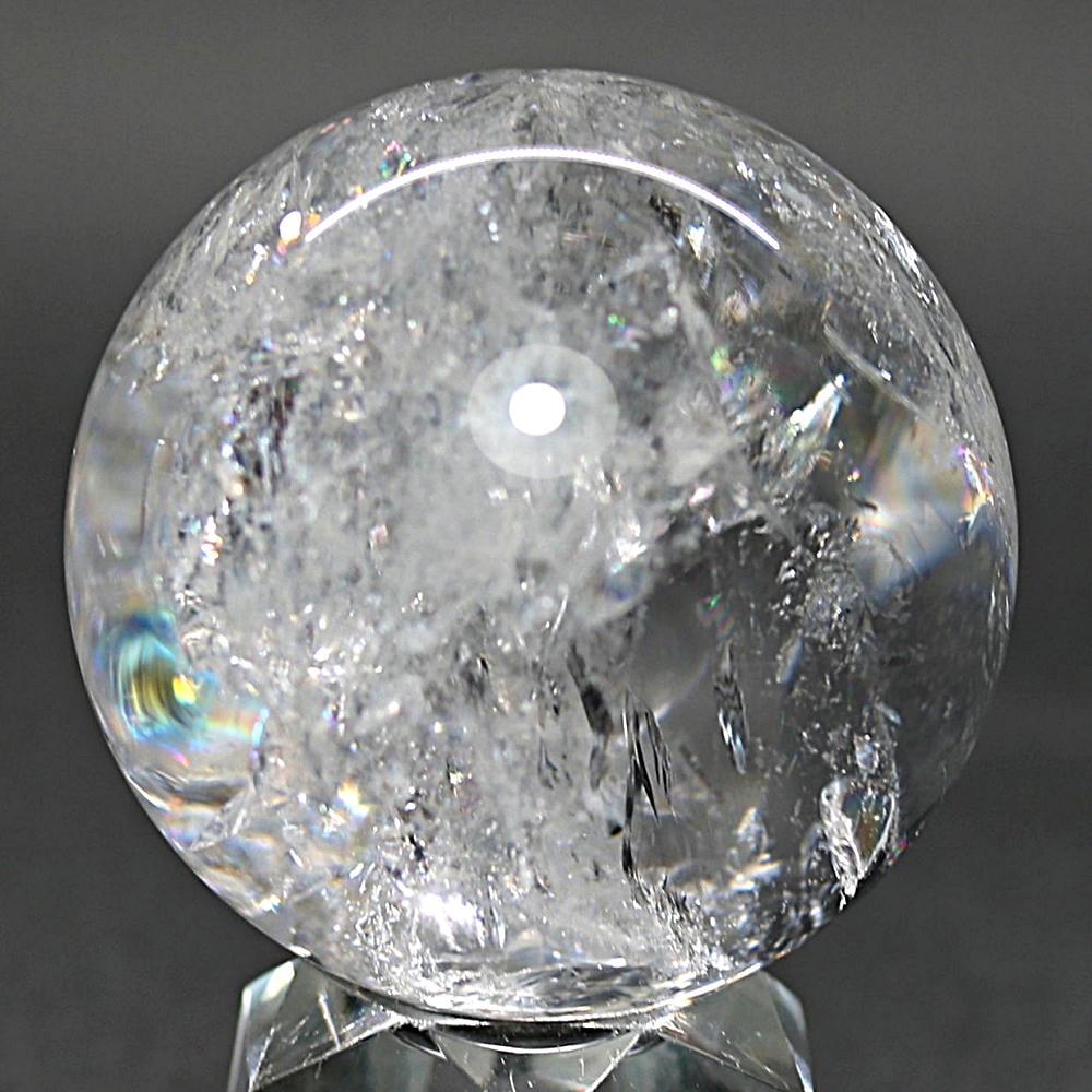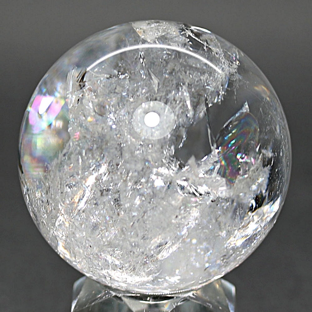 ご覧のお品は、価格を抑えつつも天然の虹をお楽しみいただける「ブラジル産レインボー水晶玉」でございます。