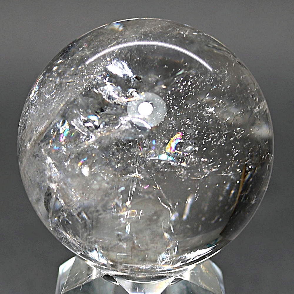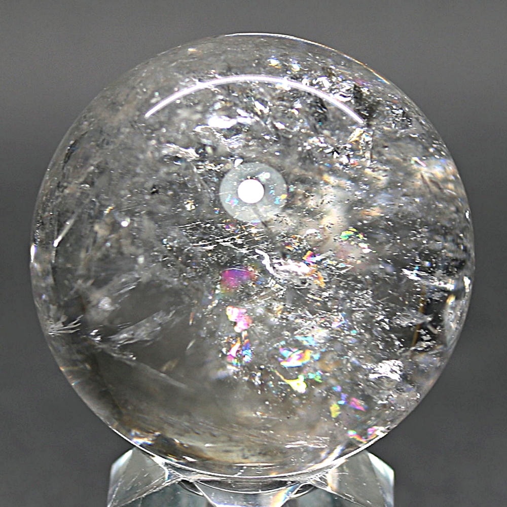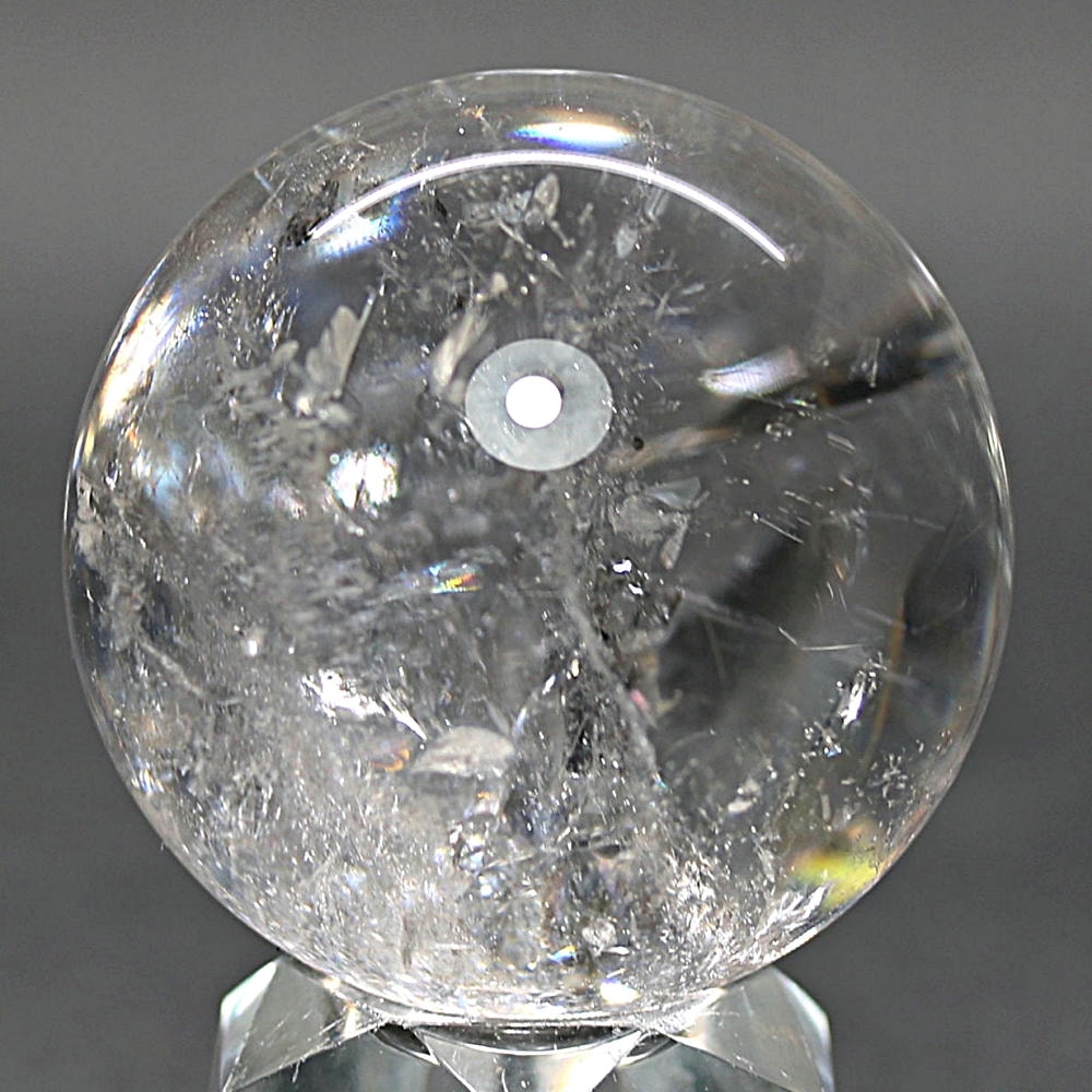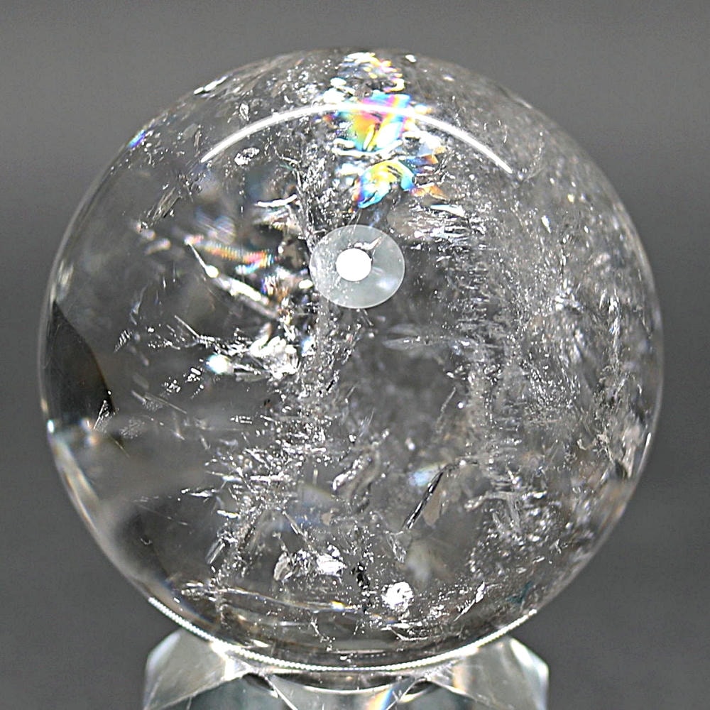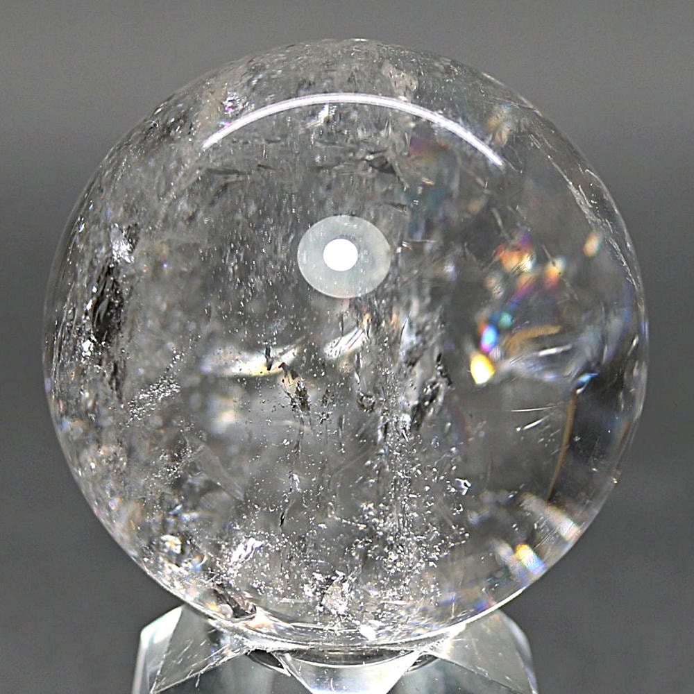 ご覧のお品は、価格を抑えつつも天然の虹をお楽しみいただける「ブラジル産レインボー水晶玉」でございます。