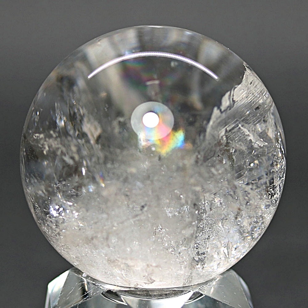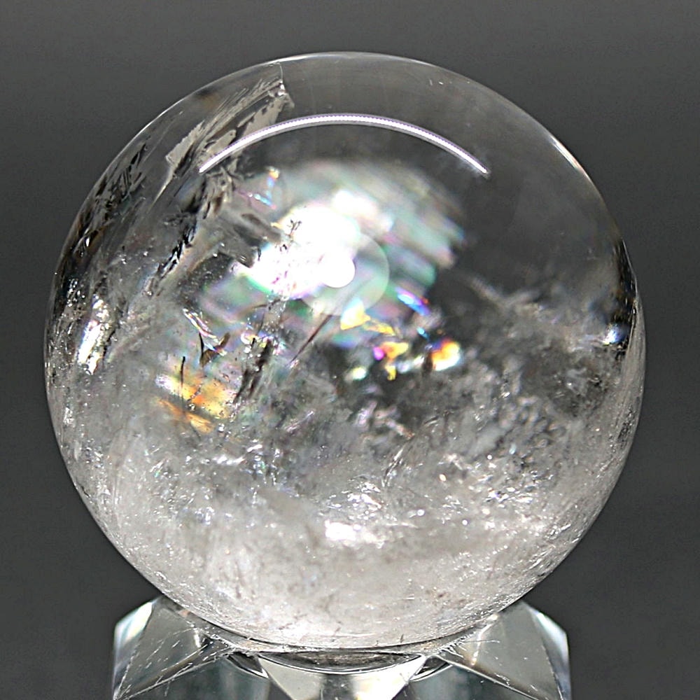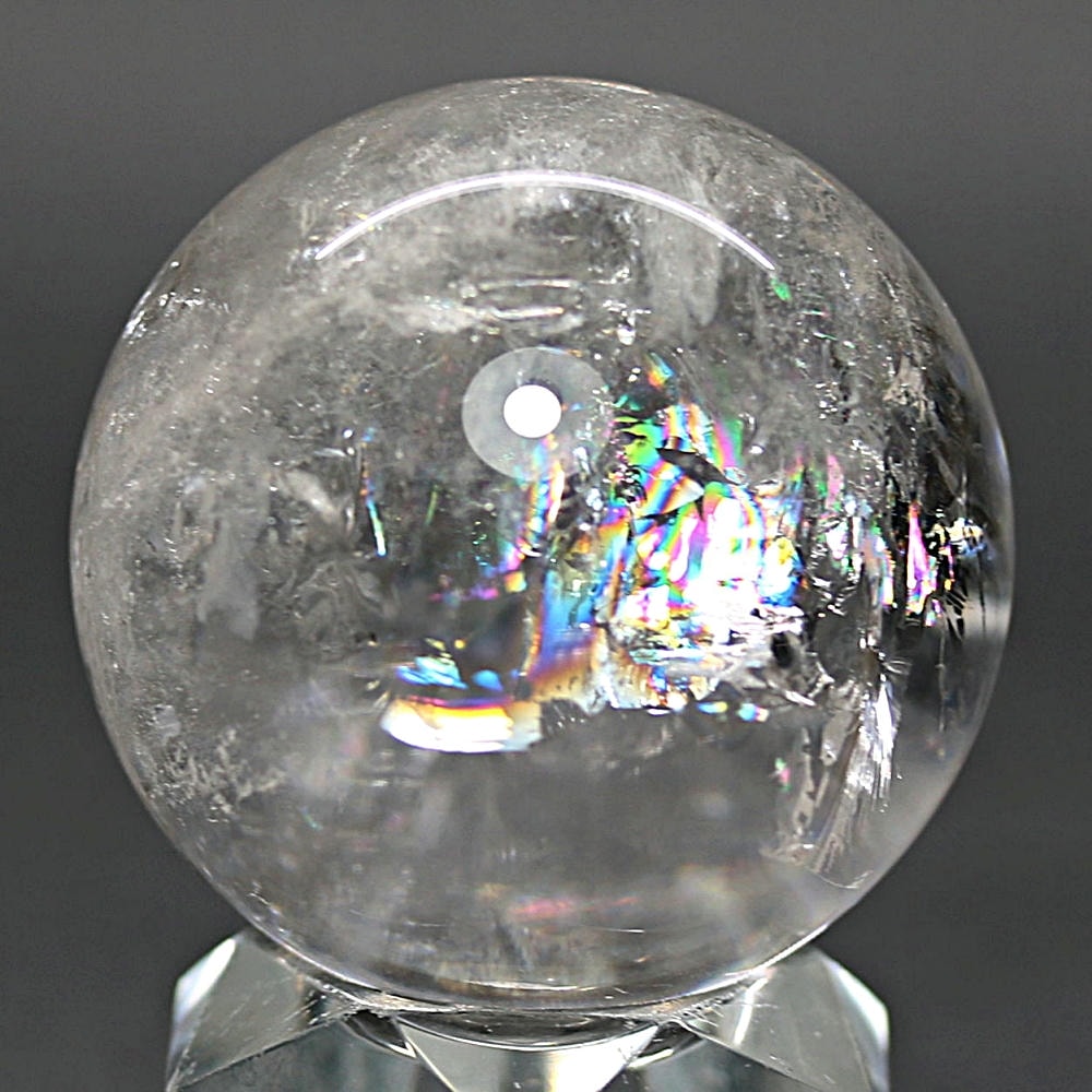 ご覧のお品は、価格を抑えつつも天然の虹をお楽しみいただける「ブラジル産レインボー水晶玉」でございます。