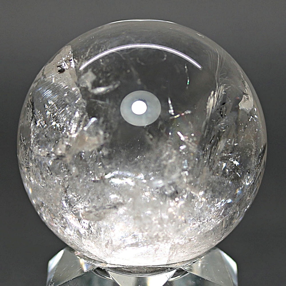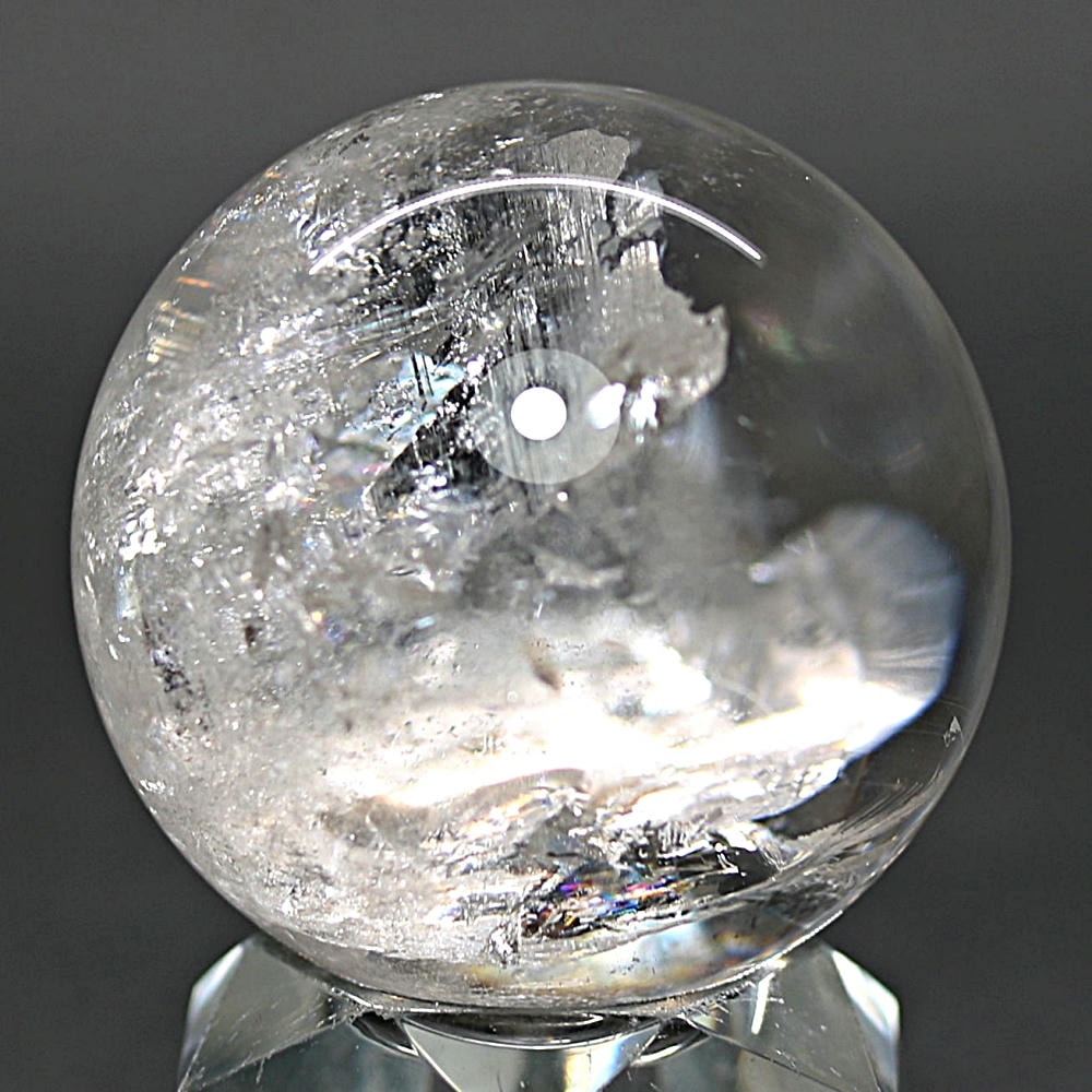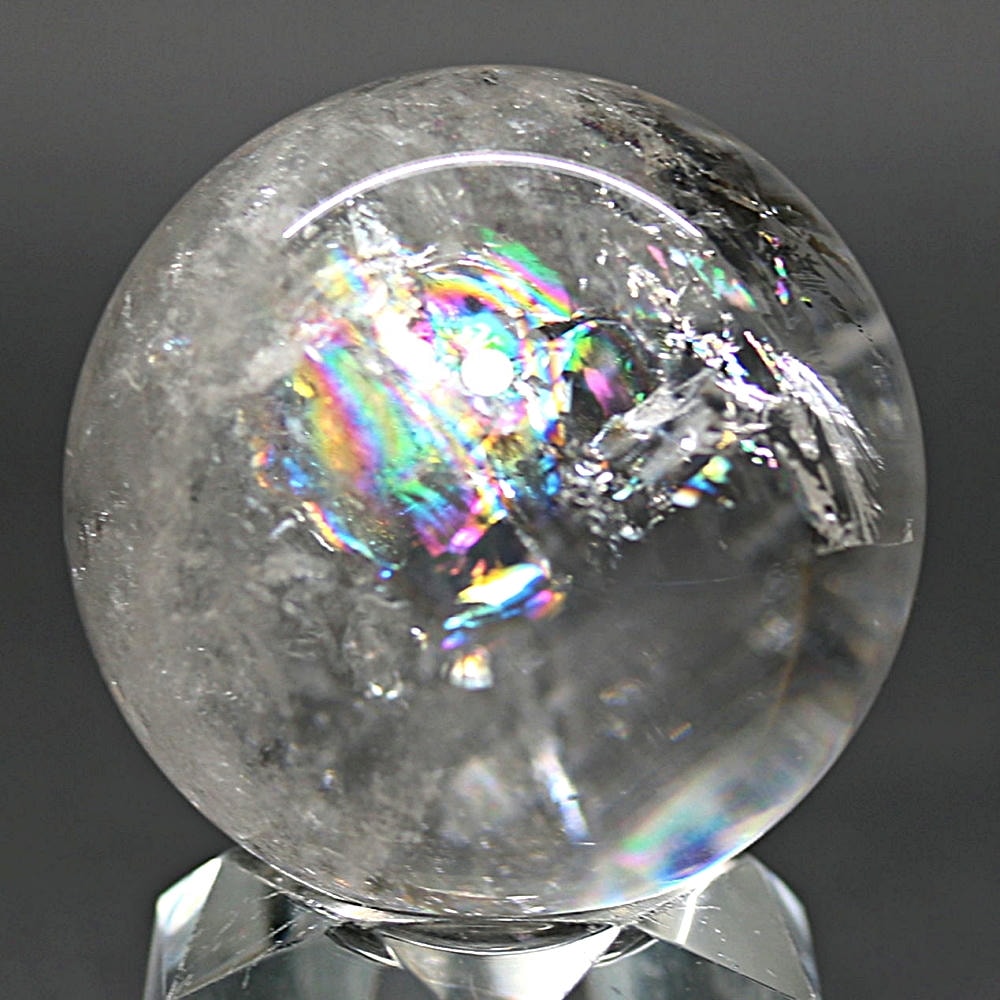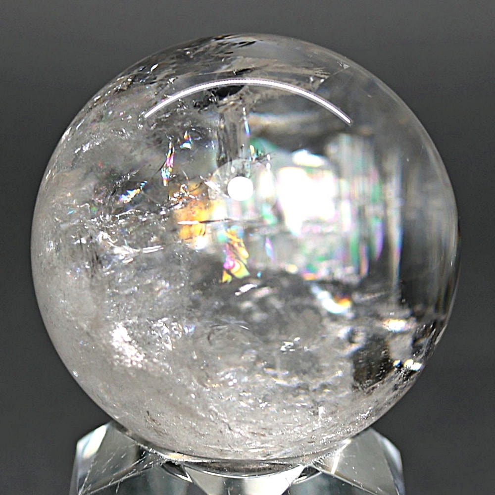 ご覧のお品は、価格を抑えつつも天然の虹をお楽しみいただける「ブラジル産レインボー水晶玉」でございます。