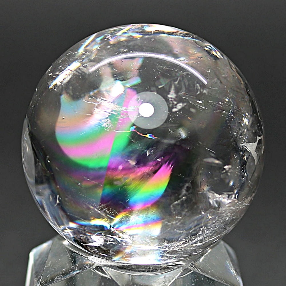 ご覧のお品は、透明度高い水晶内部に、美しい虹が現れるトップ品質に迫るクオリティの「ブラジル産天然レインボー水晶玉」でございます。