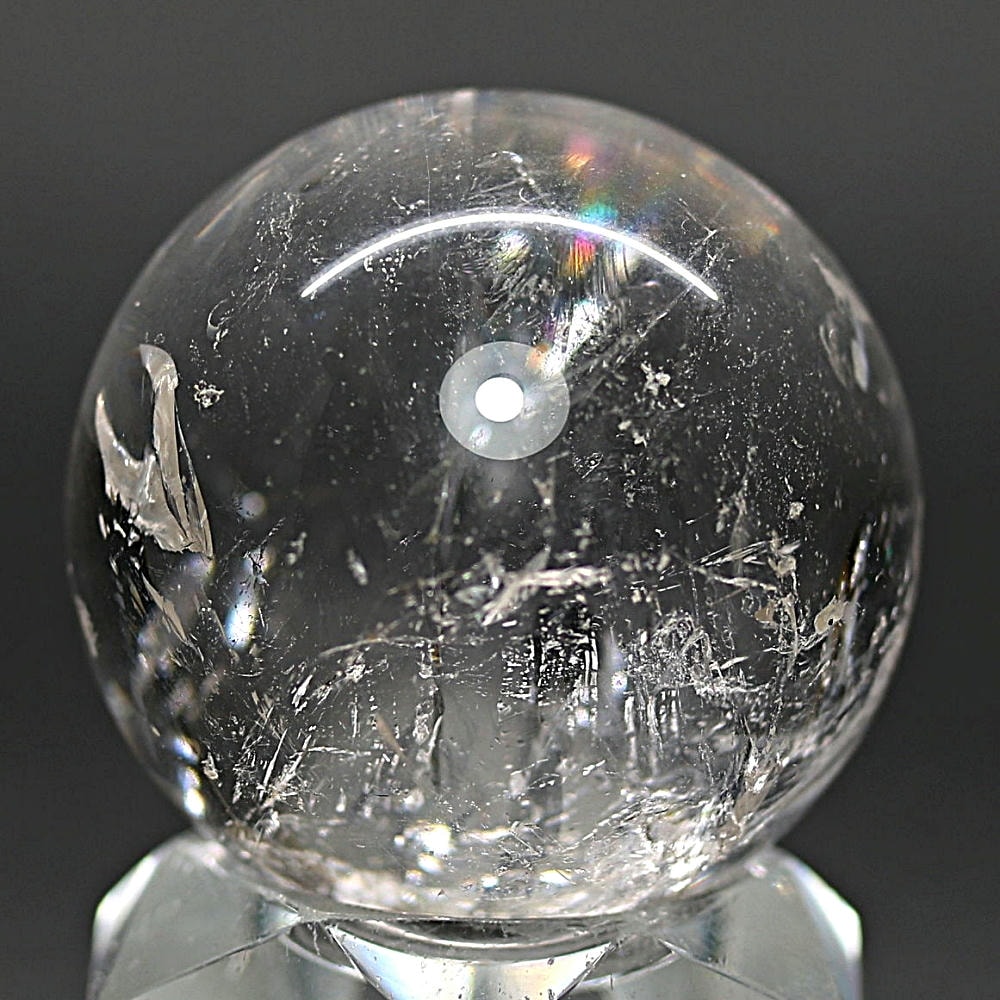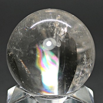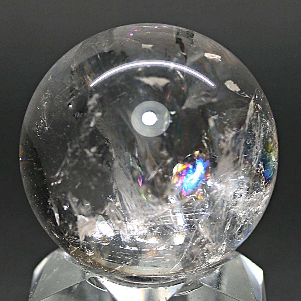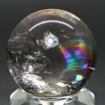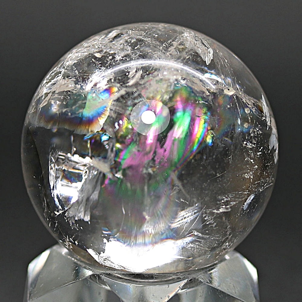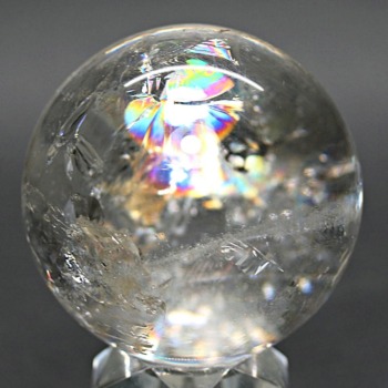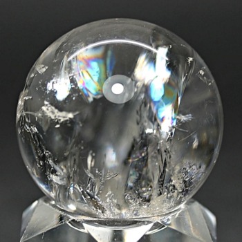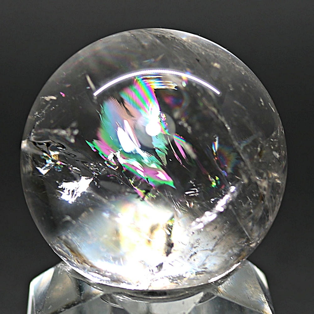 ご覧のお品は、透明度高い水晶内部に、美しい虹が現れるトップ品質に迫るクオリティの「ブラジル産天然レインボー水晶玉」でございます。