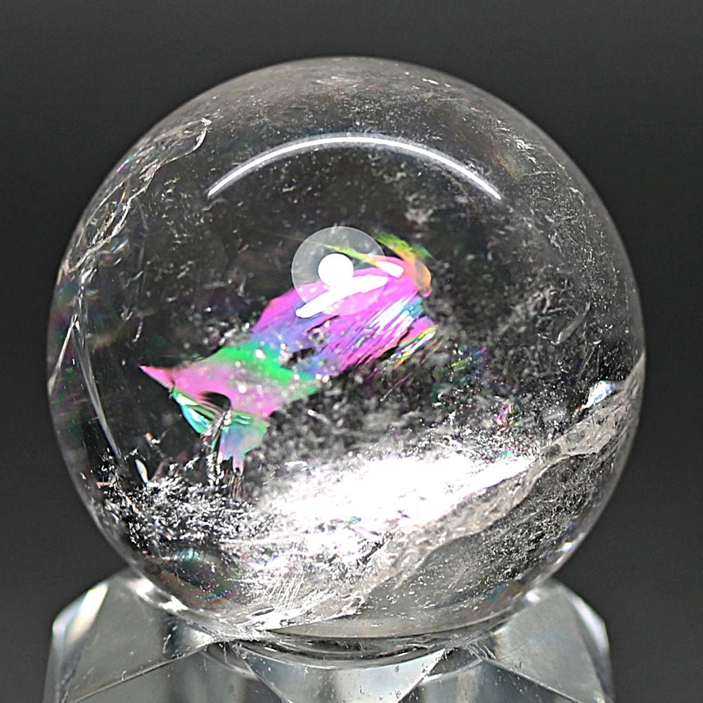 ご覧のお品は、透明度高い水晶内部に、美しい虹が現れるトップ品質に迫るクオリティの「ブラジル産天然レインボー水晶玉」でございます。