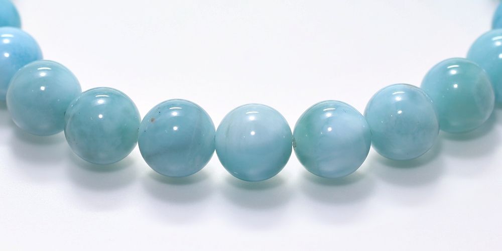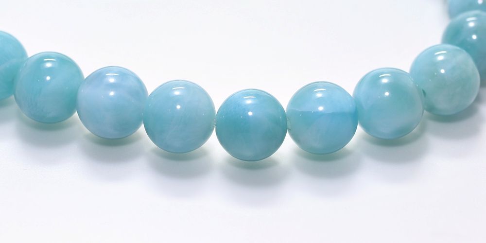 ご覧の淡いグリーンブルーのラリマーブレスレットは、ゆっくりと時間が流れるバハマのカリブ海を連想させ、漂う波模様が不思議と穏やかな気持ちにしてくれそうです。