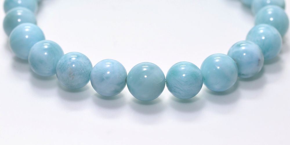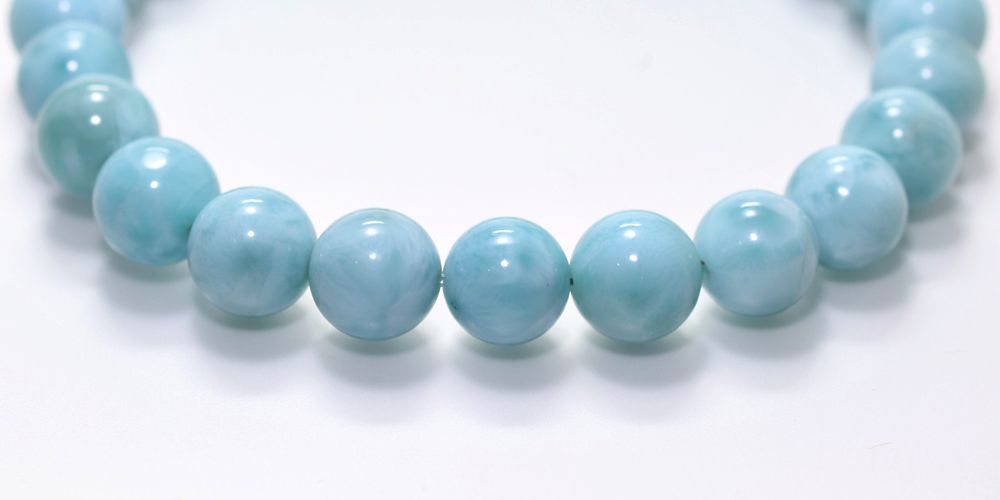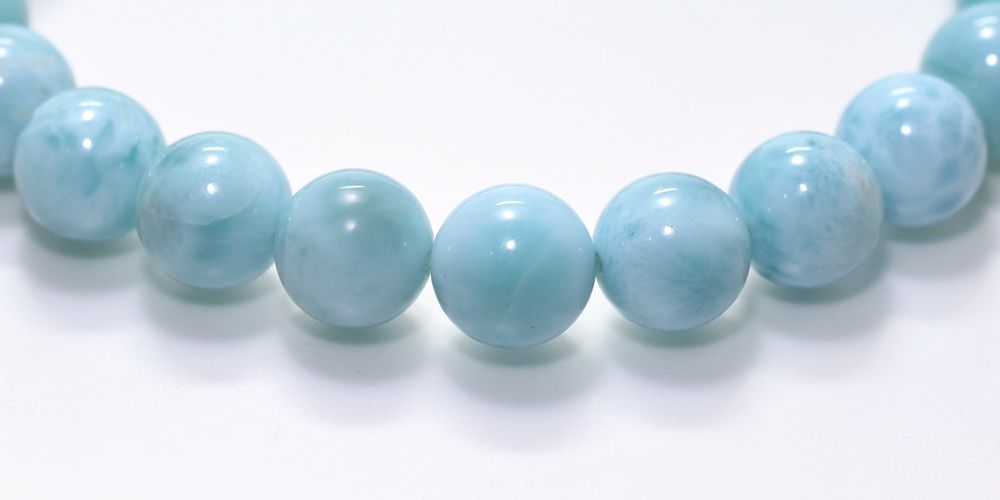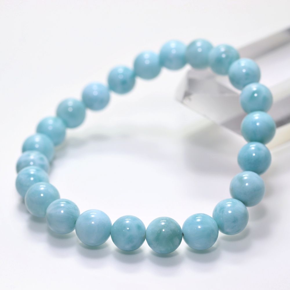 ご覧の淡いグリーンブルーのラリマーブレスレットは、ゆっくりと時間が流れるバハマのカリブ海を連想させ、漂う波模様が不思議と穏やかな気持ちにしてくれそうです。