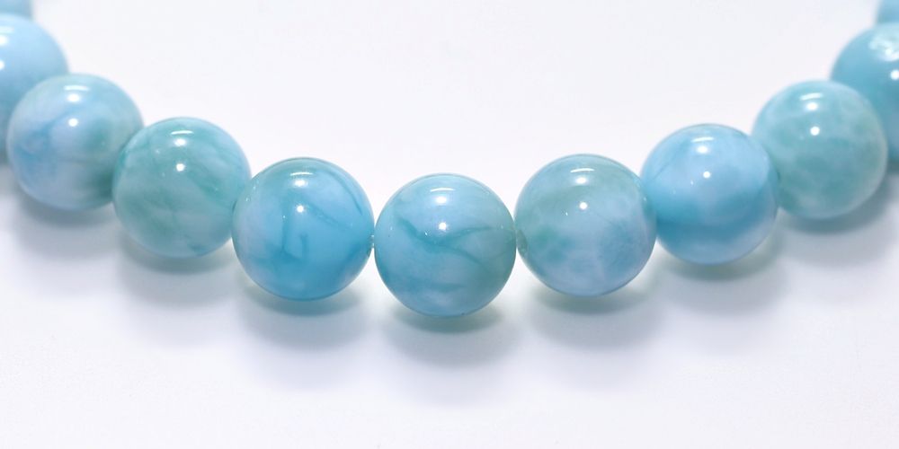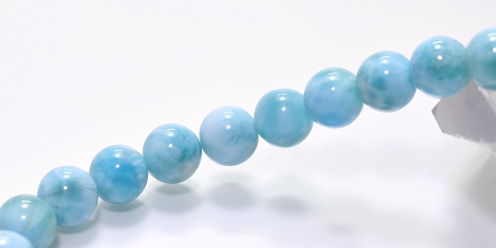ご覧の淡いグリーンブルーのラリマーブレスレットは、ゆっくりと時間が流れるバハマのカリブ海を連想させ、漂う波模様が不思議と穏やかな気持ちにしてくれそうです。